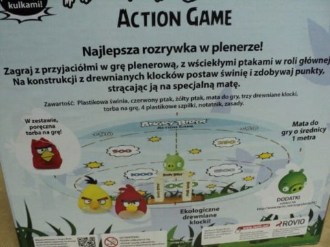 Plenerowa wersja znanej i lubianej gry Angry Birds, umożliwia zabawę nie tylko w domu, ale również na zewnątrz, w plenerze. Gra zawiera matę o średnicy 1 metra, trzy klocki z naturalnego drewna, plastikową świnię, żółtego i czerwonego ptaka wykonaneg...