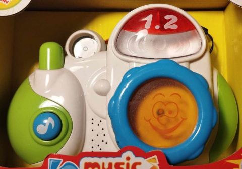 Aparat fotograficzny dla maluszka. Działa na baterie 2 [paluszki zwykłe, nie załączone. Po naciśnięciu przycisku zapali się na czerwono lampka oraz będzie słychać dźwięk migawki. Posiada dźwięki oraz wygodny pasek do trzymania. Obrotowy obiektyw z terkotką. Wymiary zabawki 16x11cm. Dla dzieci od 18 m-cy.