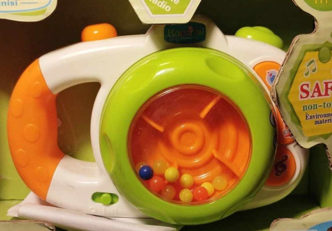 Wymiary aparatu 13x8cm. Po naciśnięciu guziczka zapala się "lampa błyskowa" i słychać charakterystyczny dźwięk zwalnianej migawki. Trzy uśmiechnięte klawisze z boku aparatu uruchamiają różne dźwięki. Ruchomy obiektyw z grzechotką - można nim kręcić w obie strony. Zabawka dla dzieci od 6 miesiąca życia.