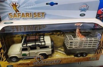 Auto metalowe Land Lover Safari z przyczepą do przewozu zwierząt + figurka żyrafy Napęd pull-back, otwierane drzwi Długość całkowita samochodu razem z przyczepą około 28cm Wiek 3
