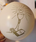 Białe balony z nadrukiem komunijnym. W kpl. 6 sztuk.