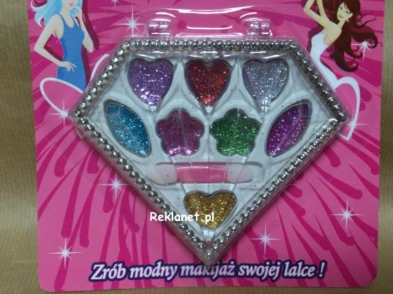 Zestaw 8 brokatowych cieni z pędzelkiem do malowania lalek. Zabawka testowana laboratoryjnie. Od lat 3.