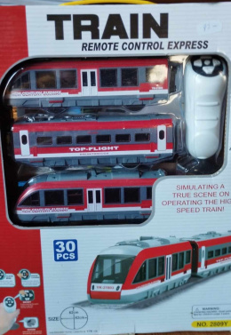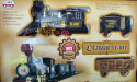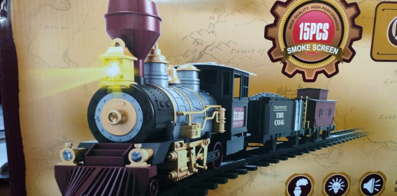 Kolejka elektryczna na baterie. Ma klasyczny wzór starej lokomotywy parowozu. W zestawie 15 elementów, w tym lokomotywa i 2 wagony. Długość całego składu ok 65cm. Kolejka posiada światła i dźwięki oraz dym z komina.