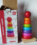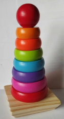 Drewniana wieża układanka edukacyjna dla maluszka. Wys. 19cm, średnica największego kółka 8,5cm. Świetnie wpływa na rozwój manualny i sensoryczny dziecka - żywe kolory, różne wielkości kółek przyciągną z pewnością uwagę maluszka. Od 36 m-ca