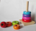 Drewniana wieża układanka edukacyjna dla maluszka. Wys. 19cm, średnica największego kółka 8,5cm. Świetnie wpływa na rozwój manualny i sensoryczny dziecka - żywe kolory, różne wielkości kółek przyciągną z pewnością uwagę maluszka.