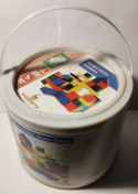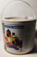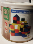 50 malowanych klocków drewnianych w wygodnym wiaderku. Różne kształty. Dla dzieci od 2 roku życia.