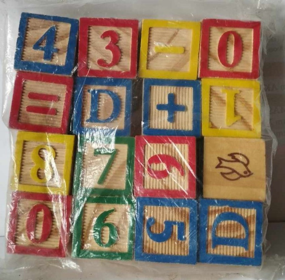Klocki kolorowe z cyferkami. Na dwóch polach - kolorowe cyferki lub znaki, na pozostałych namalowane literki, cyferki lub obrazki. W zestawie 16 klocków, wymiar klocka 3x3x3cm.
