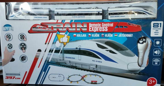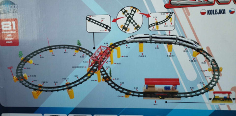 Kolejka elektryczna na baterie sterowana pilotem RC. Ma ciekawy, nowoczesny kształt Pendolino, składa się z 2 elektrowozów, wagonika, peronu oraz dużej ilości elementów torów, 3 drzewek, 2 znaków, wiadukt itp., z których dziecko może tworzyć różnorodne i przestrzenne kształty i przebiegi torowiska. Razem 81 elementów.