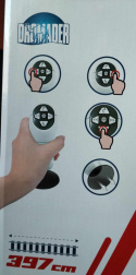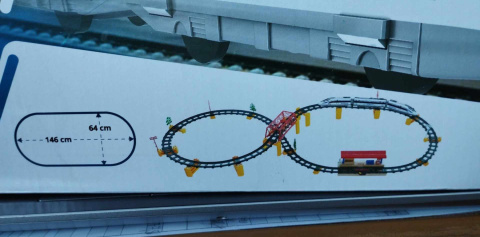 Tor w kształcie pętli o wym. 146x64cm, calkowita długość toru to 397cm. Dł. wagonów 19cm.