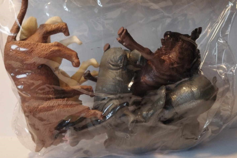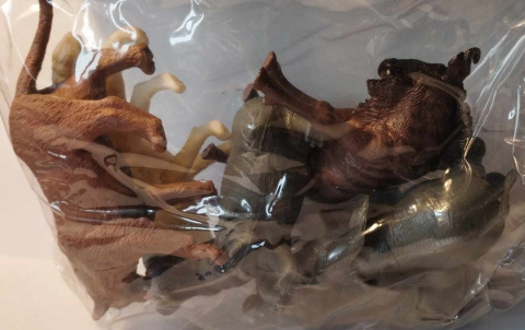 W zestawie m. in.: lwica, wilk, nosorożec, hipopotam, słoń, żubr.
