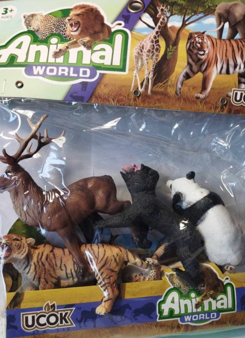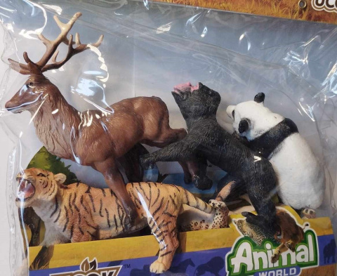 W zestawie: panda, jeleń, goryl, tygrys, lampart.