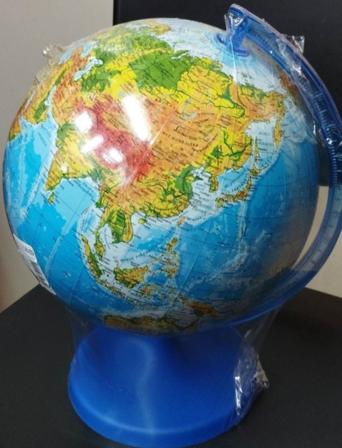 Globus plastikowy duży. Średnica kuli ziemskiej 22cm, wysokość 30cm. Globus fizyczny lub polityczny - należy określić w zamówieniu. Od lat 3
