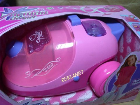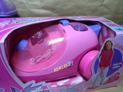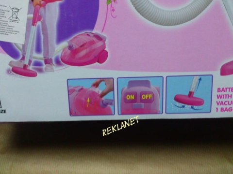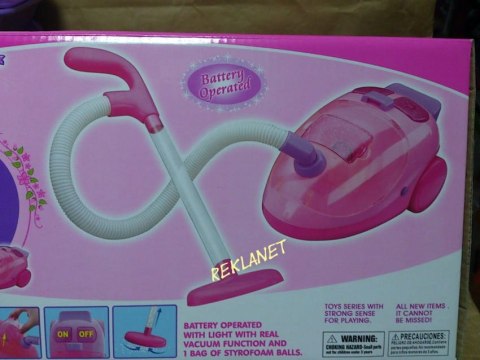 Odkurzacz na baterie (2 paluszki, nie załączone). Długość zabawki 25cm, szer. 15cm, wys. 15cm. Podczas pracy świeci się lampka wewnątrz komory na kulki i słychać pracę odkurzacza. Dla dzieci od 3 lat.