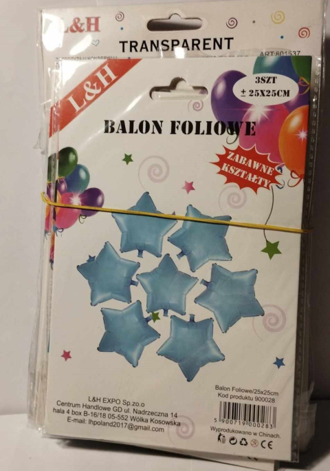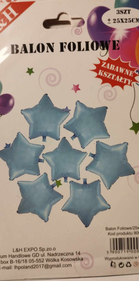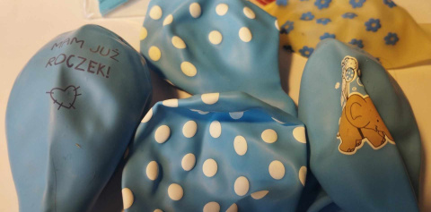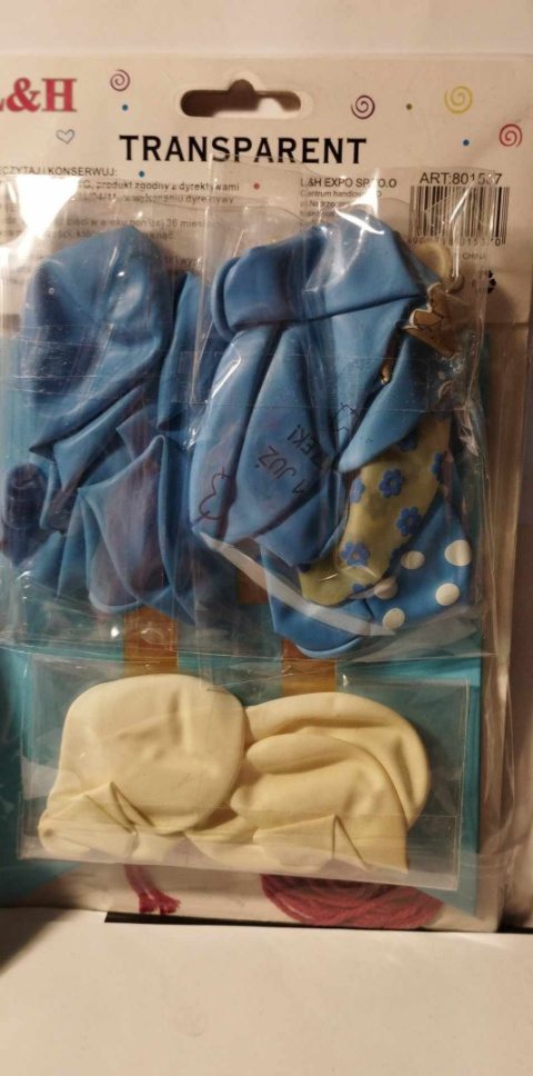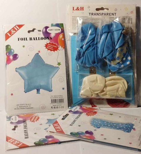 Zestaw balonów na ROCZEK. W zestawie: proporczykowa girlanda tekturowa z napisem " Happy Birthday" (2+2m) oraz balony: foliowe - cyfra 1 w gwiazdki (wys. 40cm), 3 niebieskie gwiazdki (25x25cm), 1 duża gwiazdka (45cm) oraz gumowe - 1 szt z napisem "mam już roczek" i misiem, 1szt ze słonikiem, 5 czystych niebieskich, 5 czystych białych, 1 transparentny z gwiazdkami i 2 niebieskie w białe kropki. Balony pompowane powietrzem przez załączoną słomkę. NIE UNOSZĄ SIĘ po nadmuchaniu helem. W sklepie posiadamy taśmy taśma do balonów oraz podklejki podklejki do balonów, dzięki którym balony można zamocować tak, jakby były nadmuchane helem. Do balonów z helem posiadamy również obciążniki w kształcie złotego prezentu. OBCIĄŻNIK DO BALONÓW Balony można łączyć z podobnymi z innych firm.