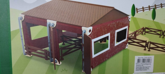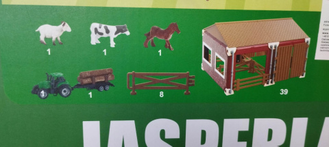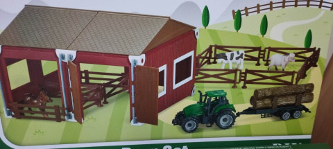 Farma rolnicza, zestaw do złożenia. Zawiera 51 elementów. W skład farmy wchodzi: budynek, konik, krówka, owieczka, płotek i traktorek z przyczepą.