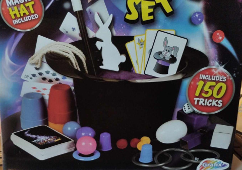 Zestaw do robienia magicznych sztuczek z kapeluszem, cylindrem magika. 150 sztuczek z użyciem kapelusza, kart, kubeczków i innych gadżetów magika. Dokładna instrukcja w zestawie.