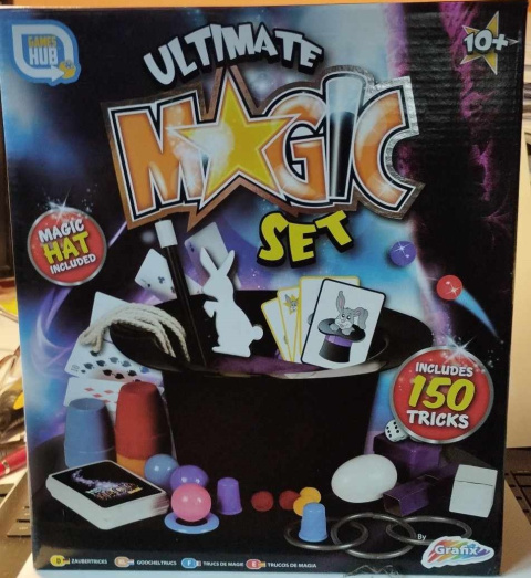 Zestaw do robienia magicznych sztuczek z kapeluszem, cylindrem magika. 150 sztuczek z użyciem kapelusza, kart, kubeczków i innych gadżetów magika. Dokładna instrukcja w zestawie. 10+