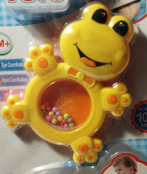 Śliczna żółta żabka grzechotka wykonana w 100% z bezpiecznych materiałów. Wysokośc grzechotki 11,5cm.