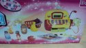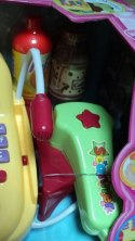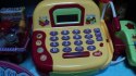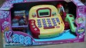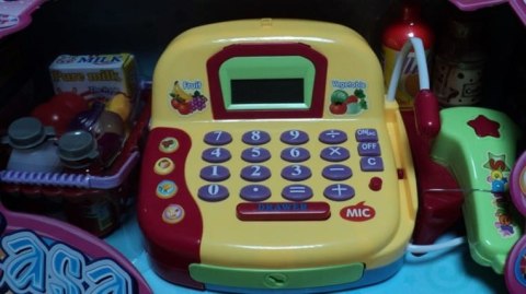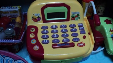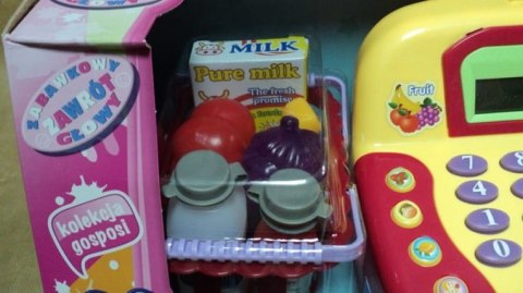 Kasa sklepowa z prawdziwym kalkulatorem, czytnikiem, wyświetlaczem i mikrofonem. W zestawie wiktuały, koszyk, karta płatnicza, pieniądze. Kasa ma otwieraną kieszeń na pieniądze.