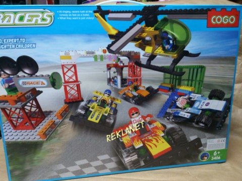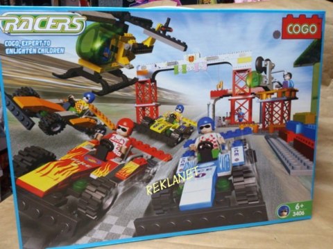 Klocki Cogo to nowa seria klocków, kompatybilnych z klockami takimi jak Lego, Sluban, Ligao itp. Zestaw zawiera 610 elementów, z których można ułożyć: bolidy, helikopter, bramkę startową, figurki. Od lat 6.