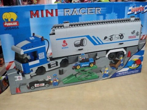 Klocki Jubilux - duży zestaw 600 elem. , z których można ułożyć ciężarówkę TIR do przewozu bolidów, bolidy, najazd do zmiany kół oraz ekipę racingową. Od lat 6.