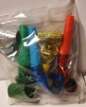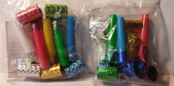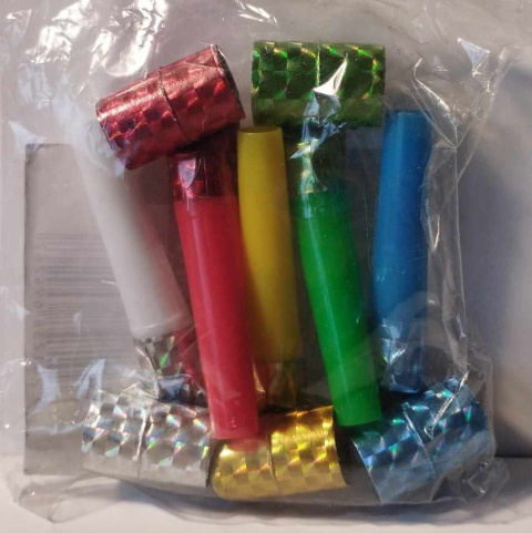 Gwizdki urodzinowe kolorowe holograficzne, rozwijające się trąbki piszczałki urodzinowe. W komplecie 5 sztuk.