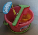 Komplet do piasku: niskie, szerokie wiaderko wys. 10cm, średnica 15cm, łopatka, grabki, sitko i 3 foremki babeczki. Zestaw w przyjemnych, pastelowych kolorach. Wiadereczko z naklejką. Od lat 3