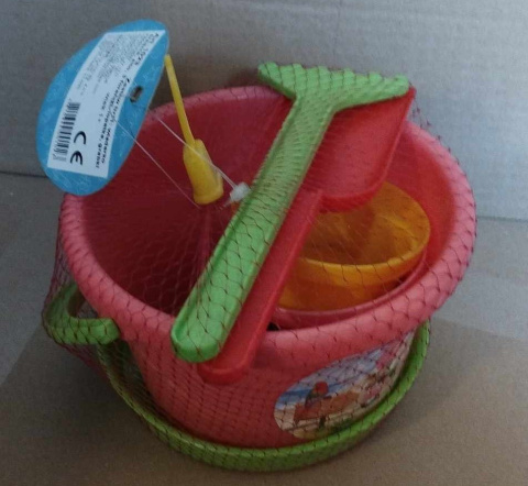 Komplet do piasku: niskie, szerokie wiaderko wys. 10cm, średnica 15cm, łopatka, grabki, sitko i 3 foremki babeczki. Zestaw w przyjemnych, pastelowych kolorach. Wiadereczko z naklejką.
