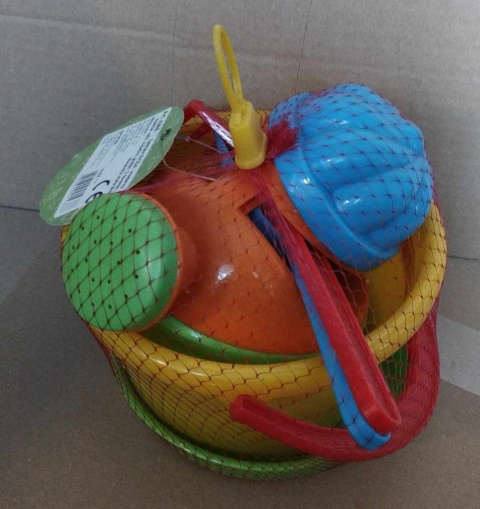 Komplet do piasku: niskie, szerokie wiaderko wys. 10cm, średnica 15cm, łopatka, grabki, sitko, 2 foremki babeczki i konewka. Zestaw w przyjemnych, kolorach. Wiadereczko z naklejką. Od lat 3