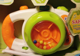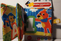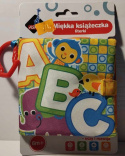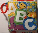 Książeczka miękka dla maluszka. 4 ortalionowe kartki z literkami. Kartki szeleszczą, pierwsza posiada piszczek, zapinana na rzep. Wym. 12x12cm. Od 6 m-ca.