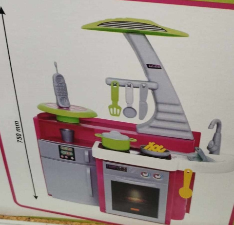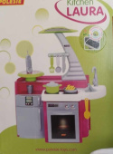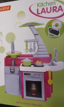 Kuchnia Laura dla małej kucharki. Wysokość z okapem 75cm. W zestawie lodówk, piekarnik oraz akcesoria kuchenne. Wykonana z bardzo dobrego jakościowo plastiku. Dla dzieci 3+