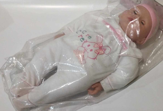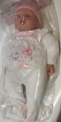 Lalka Dorotka, bobas z dźwiękiem. Długośc 45cm, tułów miękki materiałowy, rączki, nóżki i głowa silikonowe. Dla dzieci od 3 lat.