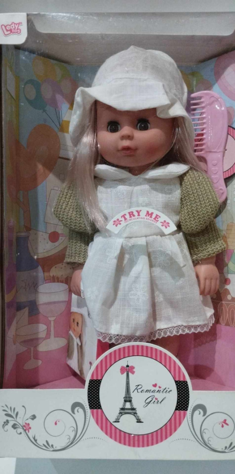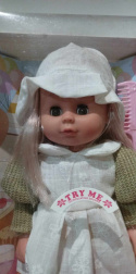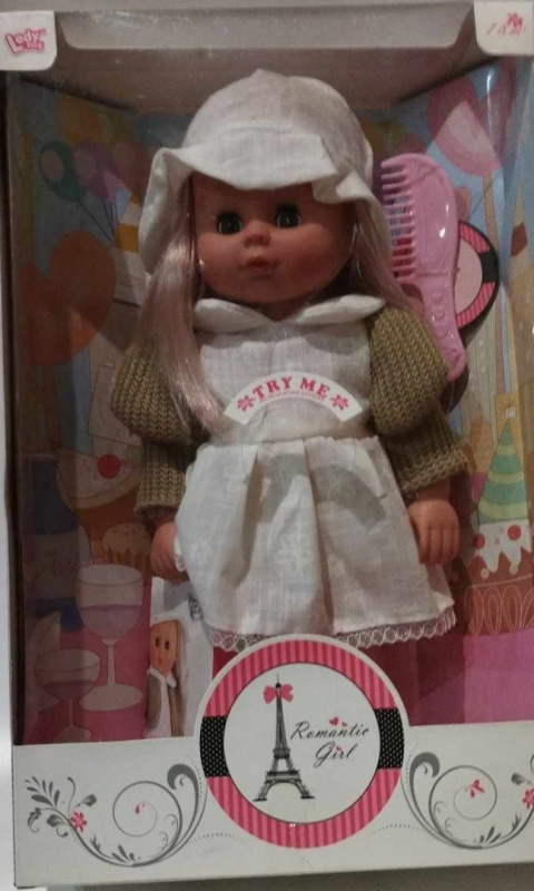 Lalka Paryżanka. Posiada 12 dźwięków - płacz, mama, tata, śmiech, gaworzenie itp. Uruchamiają się po naciśnięciu przycisku na brzuchu. Zamyka i otwiera oczy. Cała twarda, bez miękkich elementów. W zestawie z grzebykiem i torbą.