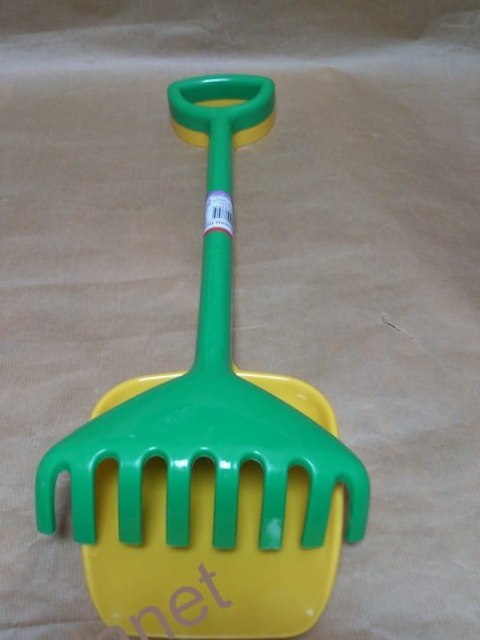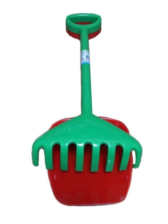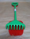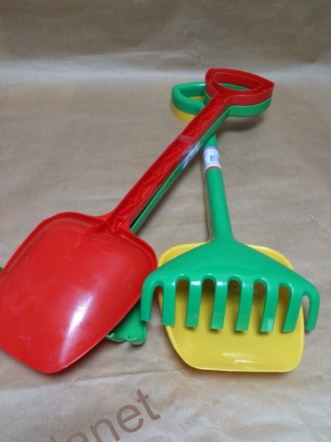 Duża łopata i grabie do piasku. Zabawka plastikowa. Długość całej zabawki 50cm, wymiary korytka łopaty 14 x 16 x 4cm szer. grabek 17cm. Produkt polski. Od lat 3.