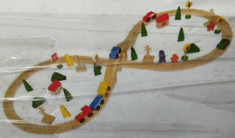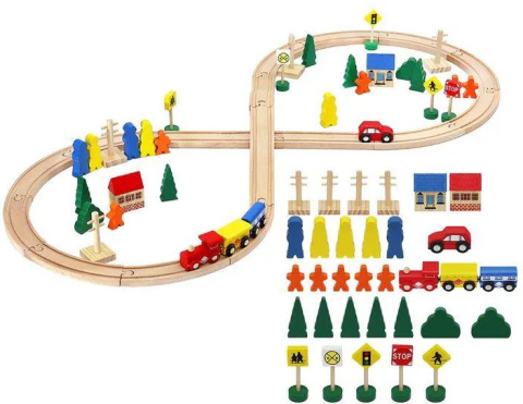 Kolejka drewniana MALATEC dla maluszka. 50 elementów, w zestawie ciuchcia, wagoniki, drzewka, znaki itp. Tor można ułożyć w ósemkę lub koło, wszystkie elementy mozna układać wg własnego uznania. Napęd kolejki ręczny.