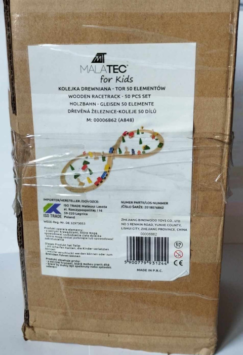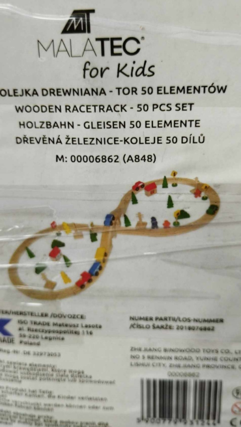 Kolejka drewniana MALATEC dla maluszka. 50 elementów, w zestawie ciuchcia, wagoniki, drzewka, znaki itp. Tor można ułożyć w ósemkę lub koło, wszystkie elementy mozna układać wg własnego uznania. Napęd kolejki ręczny. Od lat 3