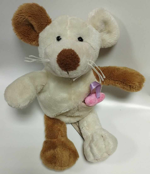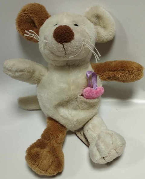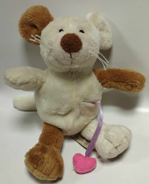 Mięciutka, milutka myszka z różowym serduszkiem. Posiada groszek, dzięki czemu może usiąść. Wysokość maskotki 22cm.