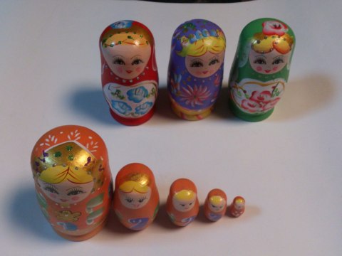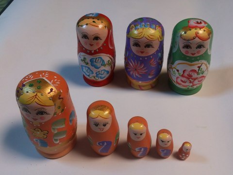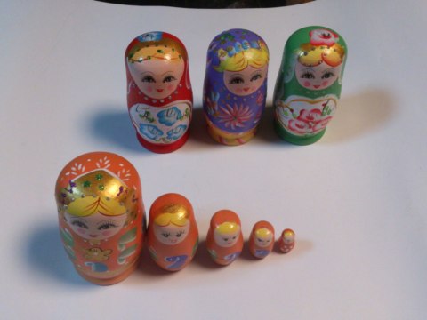 Tradycyjna rosyjska Matrioszka - 5 lalek drewnianych - od największej wys. 11,5cm do najmniejszej 2,5cm. Lalki wg wysokości chowane są w kolejności mniejsza w większą. Zabawka drewniana.