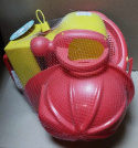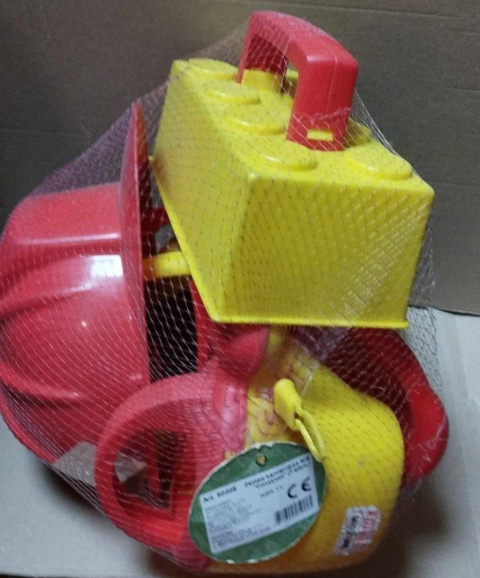 Zestaw zawiera: wiadro z sitkiem, wys. 18cm, formę do cegieł 21x10x8cm, konewkę ws. 17cm i kask.