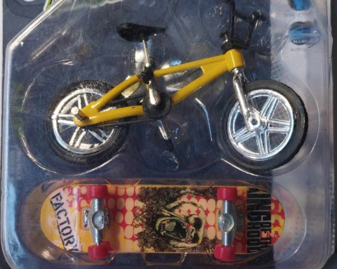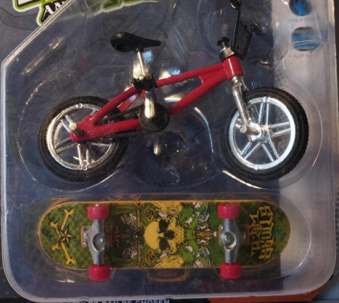 Mini model roweru i deskorolki na palec. Długośc roweru 10cm, deskoroli 9cm. Dla dzieci od 3 lat.
