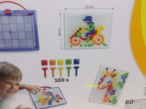 Mozaika geometryczna. Zawiera 100 różnokolorowych pionków oraz plastikową planszę do wpinania. Wymiary planszy 22 x 16cm Od lat 4.