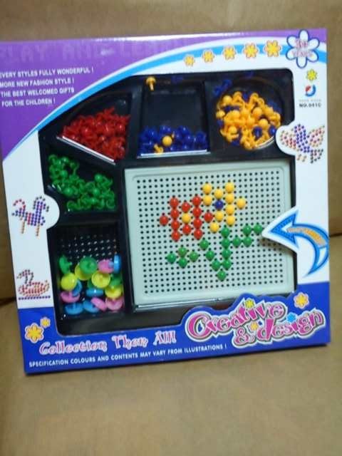 Mozaika składa się z planszy i wielokolorowych grzybków do układania różnorodnych kompozycji. Grzybki mają różną wielkość.