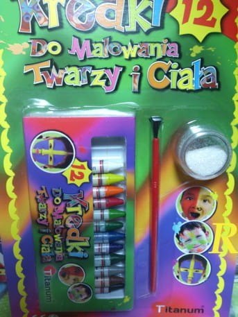 Zestaw nietoksycznych kredek do malowania twarzy. Zestaw zawiera 12 kolorów, brokat i pędzelek. Od lat 3