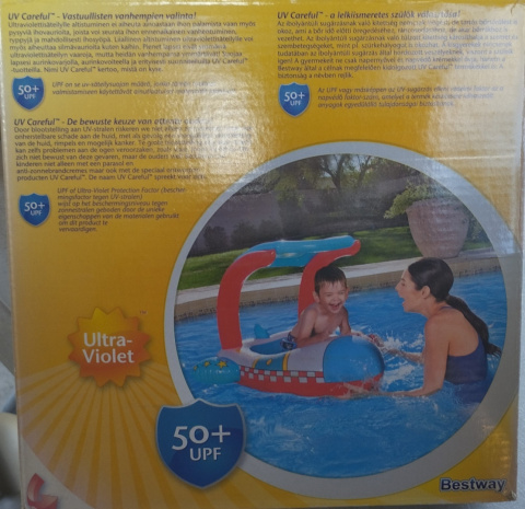 WYPRZEDAŻ! PRZECENA! - przyczyna przeceny - spłowiałe kolory opakowania, ze względu na ekspozycję w sklepie stacjonarnym. Sam produkt jest pełnowartościowy! Dmuchany samolocik, zabawka do wody. Rozmiar 1,02x0,97cm. Dla dzieci w wieku 3-6 lat.