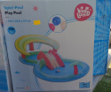 WYPRZEDAŻ! PRZECENA! - przyczyna przeceny - spłowiałe kolory opakowania, ze względu na ekspozycję w sklepie stacjonarnym. Sam produkt jest pełnowartościowy! Dmuchany basen duży wodny plac zabaw dla dzieci, ze zjeżdżalnią. Wymiary zewnętrzne 264x137x68,5cm. Od lat 3