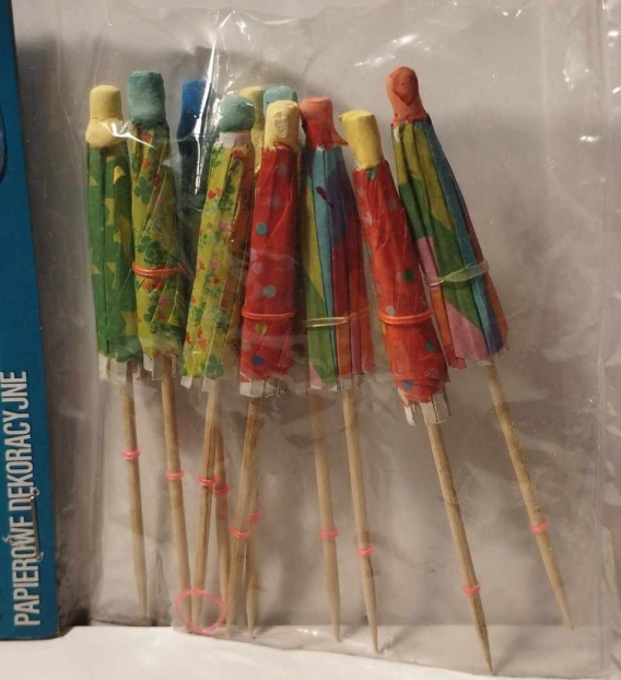 Papierowe, kolorowe parasolki do drinków. Zamocowane na drewnianych zaostrzonych trzonkach. Długośc kapelusika 4,5cm. W komplecie 10 sztuk.