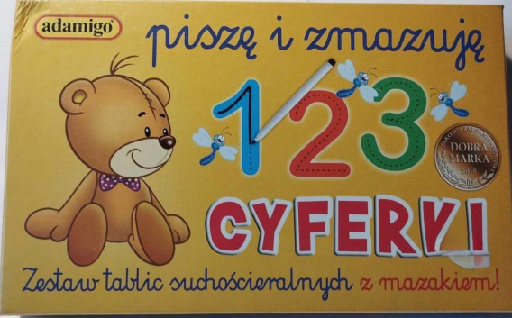 Edukacyjny zestaw 16 dwustronnych suchościeralnych tablic o wym 11,5x16,3cm do nauki pisania cyferek, z zadaniami. Zestaw zawiera marker suchościeralny i ściereczkę do ścierania. Od 5 lat.