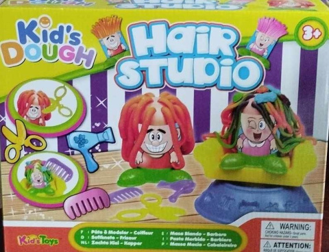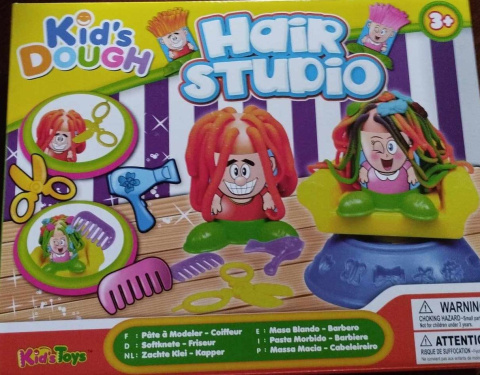 Zestaw zawiera 4 kubeczki z masą, fotel, suszarkę, grzebyk, nożyczki oraz klienta.