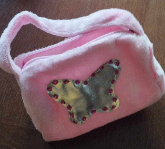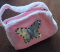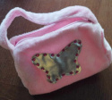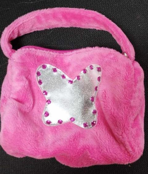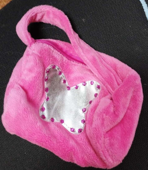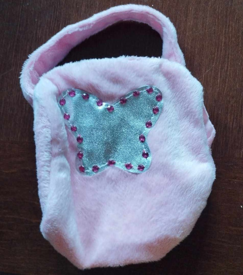 Pluszowa torebka do ręki, na krótkim pasku. Mięciutka, niezwykle miłą w dotyku. Wymiary torebeczki 15x14x6cm.