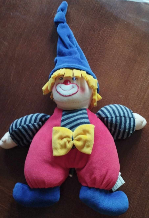 Piękna, mięciutka pluszowa zawieszka pajacyk-klaun z pozytywką. Można przypiąć ją do łóżeczka, wózeczka, nosidełka... Wysokość 30cm. Od 0 m-cy